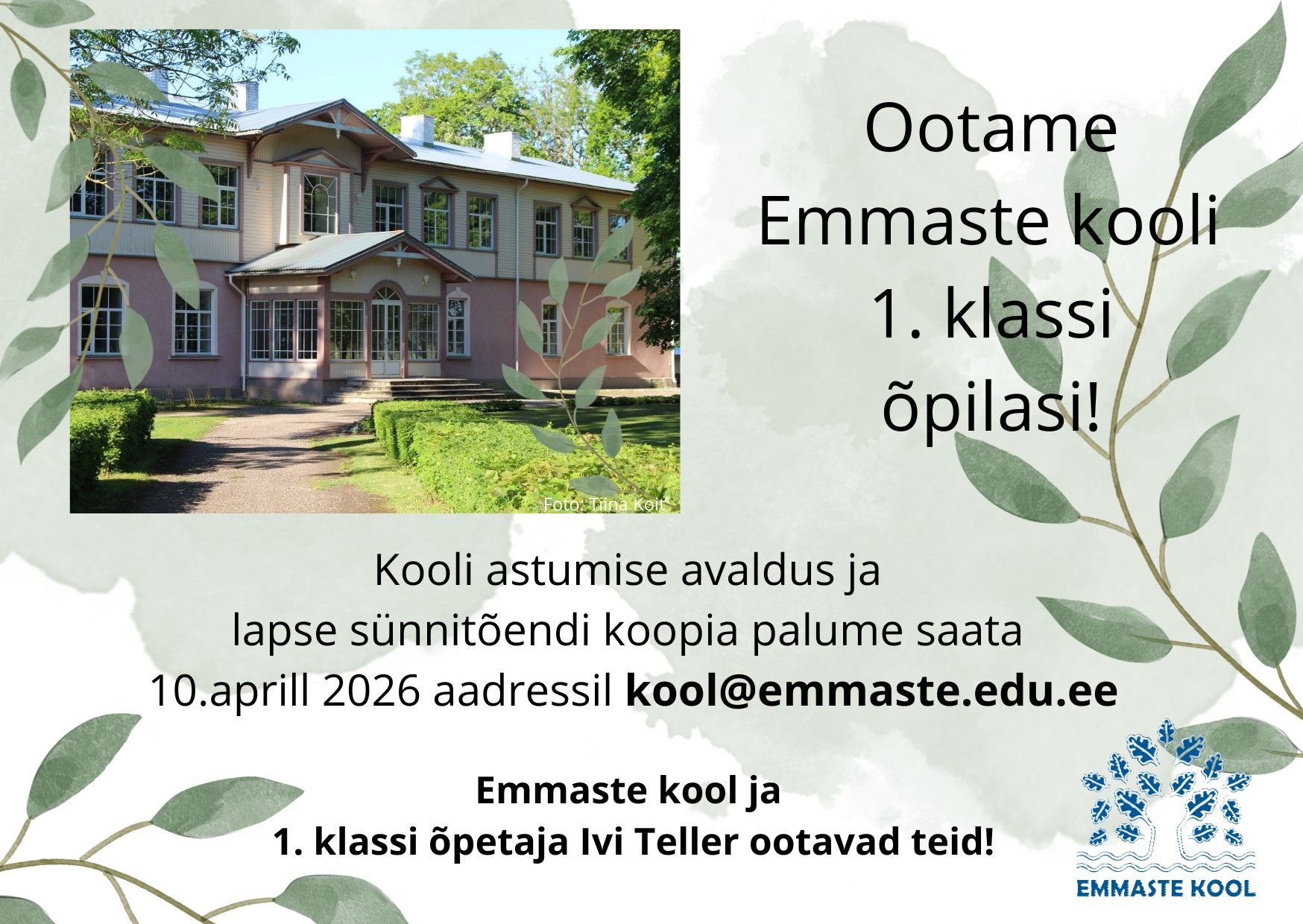 1. september Loomise kuupäev 19.08.2025 Autor Aet Sõmer Emmaste kool 105 Loomise kuupäev 10.07.2025 Autor Aet Sõmer Ootame Emmaste kooli 1. klassi õpilasi Loomise kuupäev 31.03.2025 Autor Aet Sõmer Naljapäeva kontsert 1. aprillil kell 17:30 Loomise kuupäev 31.03.2025 Autor Aet Sõmer Vaata rohkem